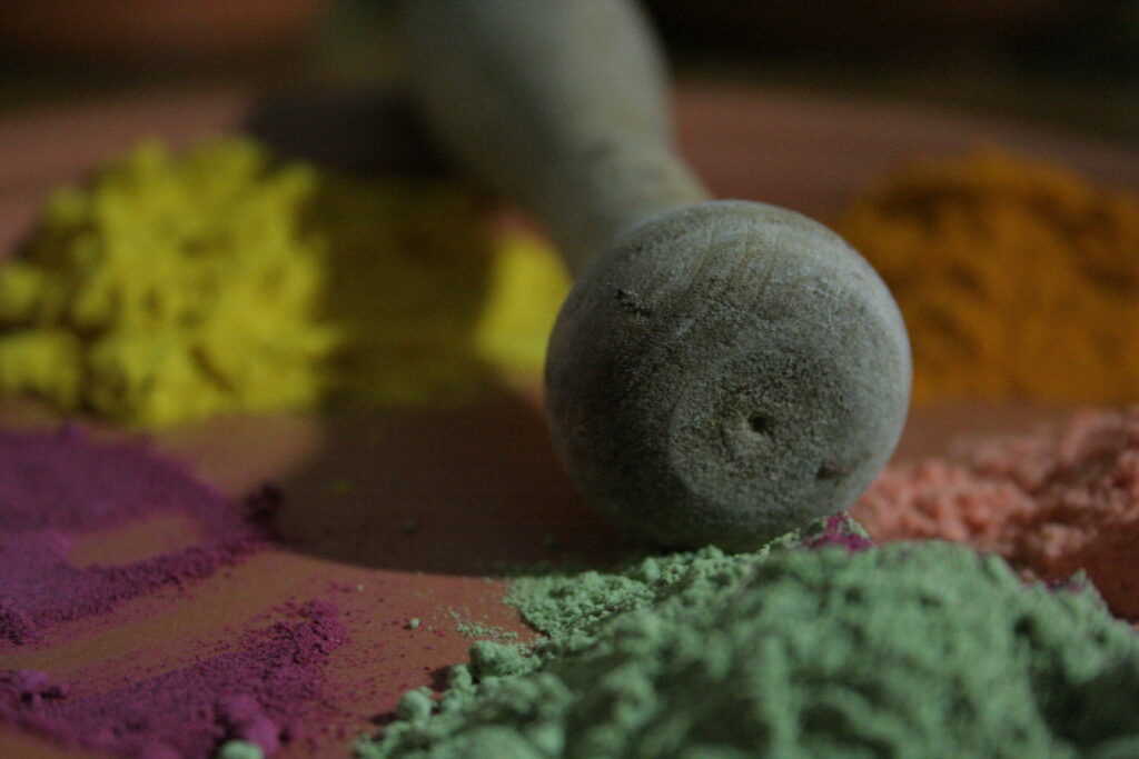 Do minério bruto à tinta aplicada na tela, o percurso revela como a disponibilidade de materiais, ao longo do tempo, condicionou as escolhas estéticas e suas possibilidades criativas. “Nos acostumamos a consumir a cor pronta, sem saber exatamente de onde ela vem ou do que ela é feita. Quando você entende que a tinta nasce de uma rocha ou de algum outro mineral, muda a sua forma de olhar e, também, de escolher o que usar no processo de criação”, afirma Spnela.